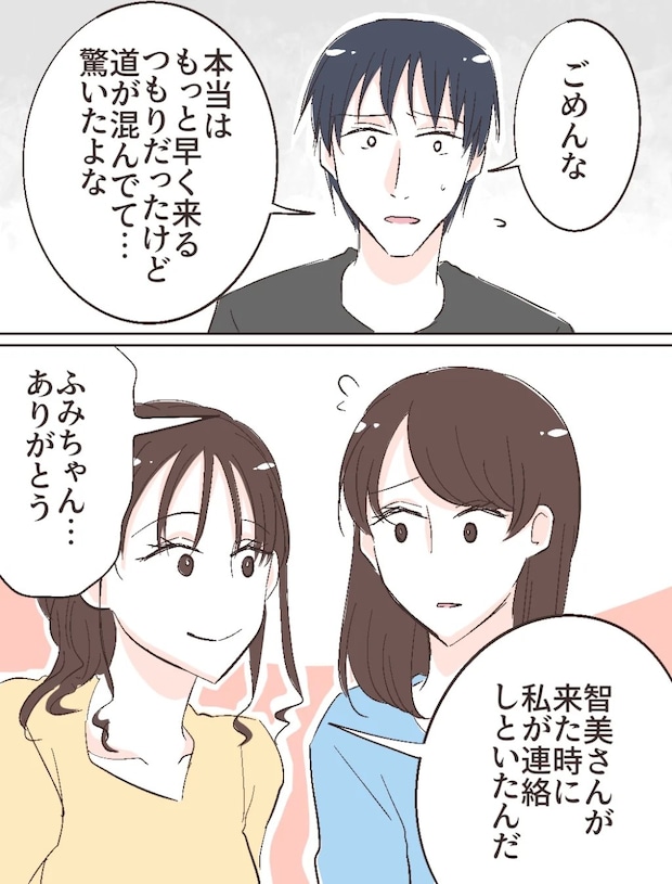 修吾は私に視線を向けると、「ごめんな、本当はもっと早く来るつもりだったけど道が混んでて・・・驚いたよな」と申し訳なさそうに言いました。どうやら智美さんが押しかけてきたタイミングで、ふみのが修吾に連絡を入れてくれていたようです。