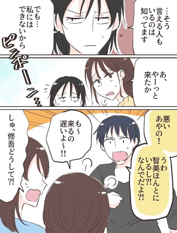 智美さんは眉をひそめると、「・・・そう言える人もいるのは知ってます、でも私にはできないから」と、どこか自信なさげに答えました。その瞬間、ピンポーンとインターホンが鳴り、修吾が現れました。玄関に入るなり、「悪いあやの!うわ、智美ほんとにいるし、なんでだよ!?」と驚きます。