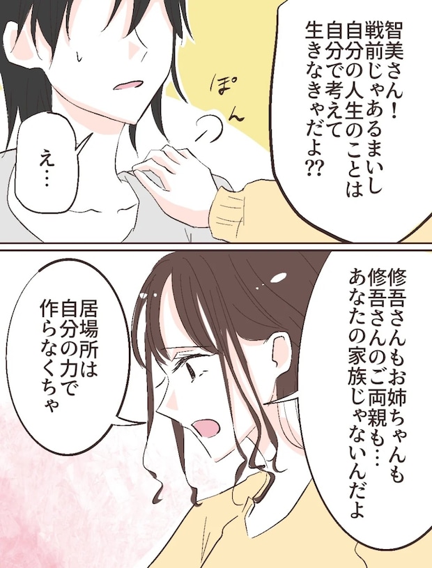 私があたふたしていると、横にいたふみのが智美さんの肩にポンと手を置き「戦前じゃあるまいし、自分の人生のことは自分で考えて生きなきゃだよ?修吾さんもお姉ちゃんも修吾さんのご両親も、あなたの家族じゃないんだよ・・・居場所は自分の力で作らなくちゃ」と諭すように言いました。