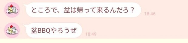 「盆BBQやろうぜ」という誘う流れもメッセージも、完璧な地元の友達で思わず笑ってしまいました。BBQというチョイスにも、友人からのお誘いの感じが溢れていますね。