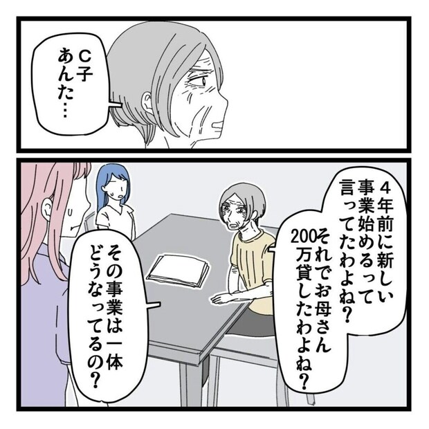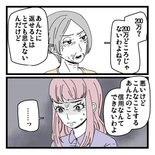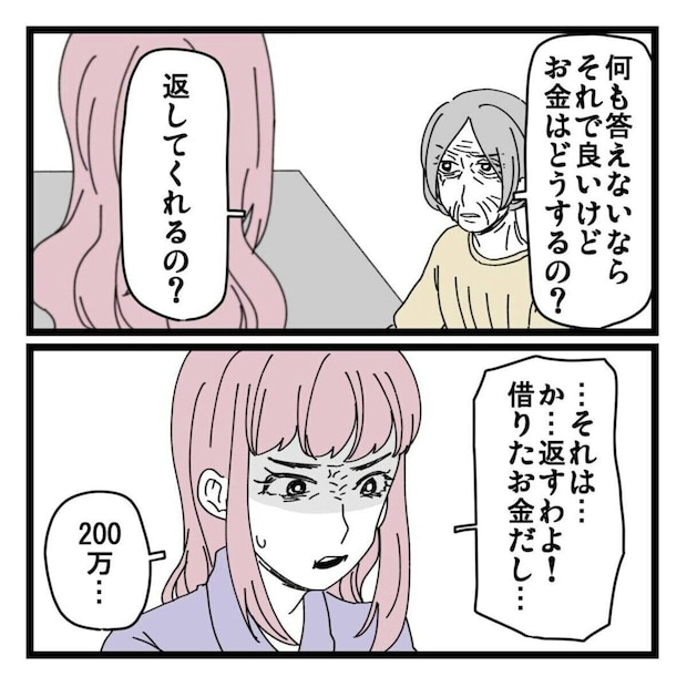「200万円は返す」という義姉に対し「200万どころじゃない。あんたに返せると思えないんだけど」と厳しい口調で話す義母。あくまでも義姉は使い込んだ900万を返済する気はないようで驚きですよね。自分はもらって当たり前だと思っていたのでしょうか…。義母にとっては信じていた娘に裏切られ、謝罪もなければ懲りずに遺産のことまで言い出す姿にショックを通り越して怒りしかなかったでしょうね。