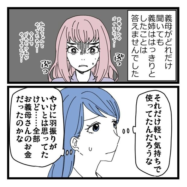 バレるとは思わなかったのか、それとも義母のお金を使うことが当たり前になっていたのかはわかりませんが、あまりにも自分勝手な義姉にほぺ美さんもすっかりあきれているようです。これまで自分に見せていた羽振りの良さは全部うそだったということがハッキリして、何とも言えない気持ちになったのではないでしょうか。
