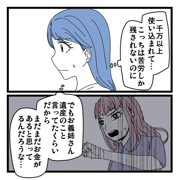 義母に何かあった時、遺産を期待して再び義姉が現れて一悶着があるのではないかと不安に思っているほぺ美さん。この義姉なら十分に有り得る話のように思えますよね。お金に関するトラブルは時に家族をバラバラにしてしまうほど恐ろしいものです。高齢の両親のお金の管理を子どもがするというのはよくあることだと思いますが、こういったトラブルにならないようあらかじめ話し合いをし、1人がお金の管理をすることがないよう気をつけなければいけないのかもしれませんね。