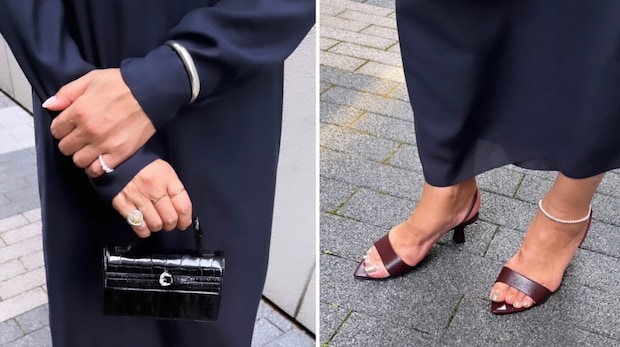 「フレンチシックな手回りや小ぶりバッグが映えます。シックなネイビーのドレスに合わせたシューズは秋注目のボルドー。ドレスと小物のカラートーンを楽しみたい」ドレス¥28,600(ヴェルメイユ パー イエナ/ヴェルメイユ パー イエナ 青山店)
