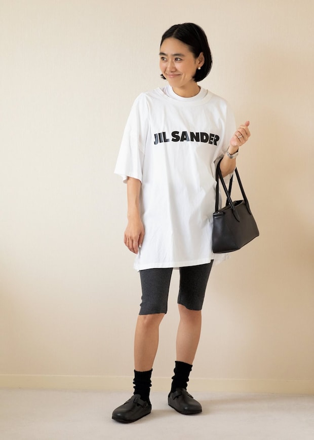 「オーバーサイズのTシャツにサイクリングショーツを合わせたカジュアルなスタイリングですが、ブランドロゴの力(笑)と小物をブラックでまとめることで、ラフになり過ぎないようにしました」