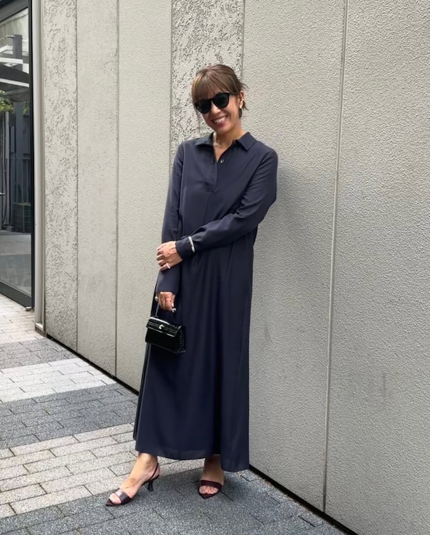 ワンカラーのドレスはミニバッグや足元のヒール、ジュエリーのレイヤードで華やかにドレスアップ。「シックなネイビーのドレスにはフレンチシックな手まわりや小ぶりバッグが映えます。シューズは秋注目のボルドーをセレクトしました」