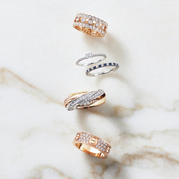 上から:〈ブロドリー ドゥ カルティエ〉[PG×DIA]¥3,841,200、〈エタンセル ドゥ カルティエ〉[WG×DIA]¥511,500、〈エタンセル ドゥ カルティエ〉[PT×DIA×サファイア]¥753,500、〈トリニティ〉[WG×YG×PG×DIA]¥4,118,400、〈LOVE〉[PG×DIA]¥1,623,600(全てカルティエ/カルティエ カスタマー サービスセンター)