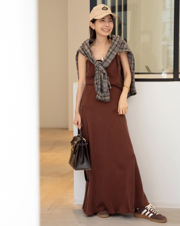 ドレス¥35,200、スカート¥56,100(共にシャイナ モート)、キャップ¥11,000(グッド グリーフ/全てアパルトモン青山店)、HERMÈSのバッグ、ヴィンテージのシャツ、ADDIDASのスニーカー、LIZZIE MANDLERのピアス、MANONのネックレス、GABRIELA ARTIGASのバングルとリングは本人私物
