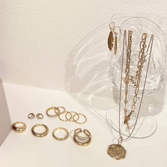 「どのリングをどう合わせるか、組み合わせを考えるのが楽しいです。基本はゴールド派なのですが、シルバーカラーのジュエリーもダイヤモンドが付いたものをミックスさせるだけで自分のスタイルに落とし込むことができることが分かり、今では欠かせない存在に」