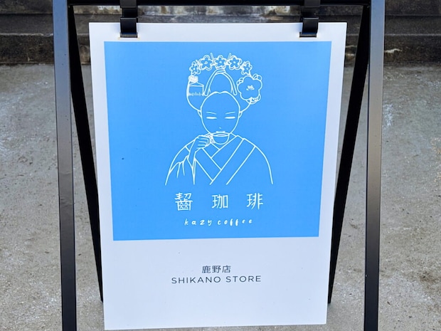 目を引く鮮やかな青色のロゴのカフェ。実はこのロゴをよく見ると京都の舞子さんがコップをかじっているんです。店名の「kazy(かじー)coffee」につながっています。ユーモアのある店名ですね!