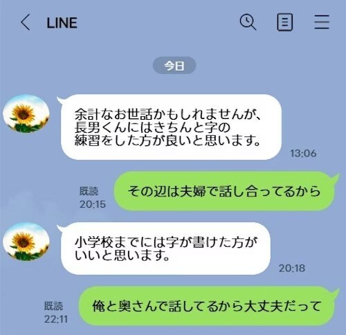 そうした背景を知ってか知らずか、義母は「文字の練習をさせた方がいい」と夫にLINEをしてきたとのこと…。この義母からのメッセージに投稿者さんは少なからずショックを受けたそうです。