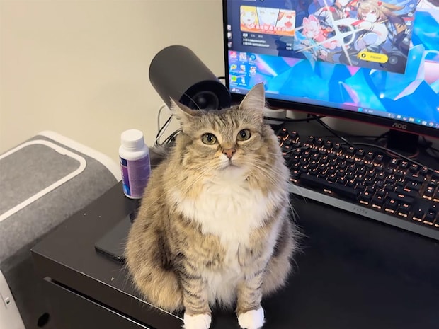 先回りしてモニターの前にちょこんと座り、