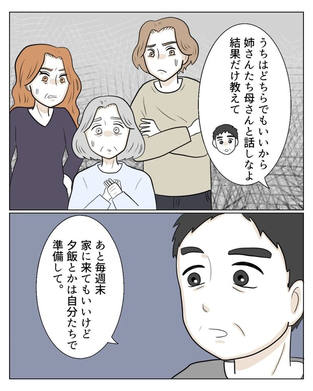 和也さんは「うちはどちらでもいいから、姉さんたち母さんと話しなよ。結果だけ教えて。あと、毎週末家に来てもいいけど、夕飯とかは自分たちで準備して」とエミさんとタクマさんに淡々と伝え、
