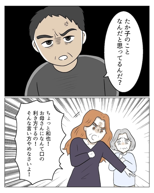 「たか子のことなんだと思ってるんだ?」と和也さんが義母に詰め寄ると、「ちょっと和也!お母さんになんて口の利き方するの!そんな言い方やめなさいよ!」とエミさんが口を挟みました。エミさんに庇ってもらい黙って涙ぐむ義母。和也さんにここまで言われても、義母はやはり自分は被害者だと思っているようでした。