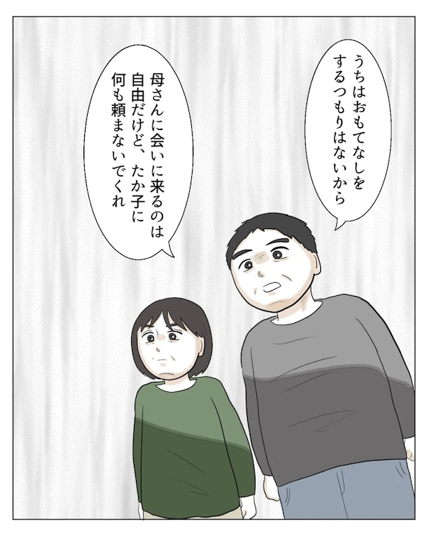 「うちはおもてなしをするつもりはないから。母さんに会いに来るのは自由だけど、たか子に何も頼まないでくれ」ときっぱり言ってくれました。