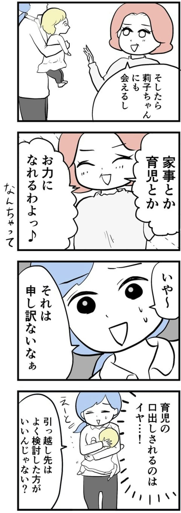 喜美子さんは「近所に引っ越せば家事や育児を手伝える」と善意を口にしますが、まゆさんは内心モヤモヤ。