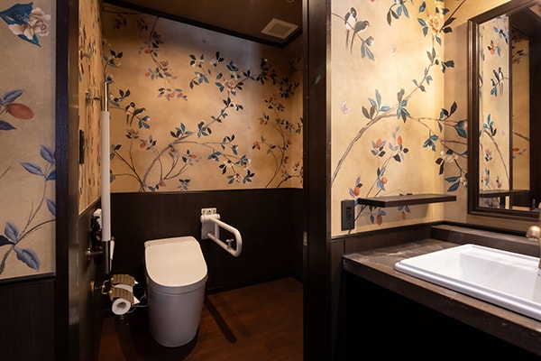 洗面にもシノワズリの壁紙を使用