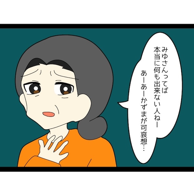 幸せな結婚生活を思い描いていたみゆさんは、夫の実家での暮らしに絶望。義母に愚痴を言われ、いじめられつらい毎日を過ごすのでした。そのつらさを夫・かずまさんに伝えても受け止めてもらえず、義母に強く影響されている姿に、みゆさんは孤独を深めてしまいます。
