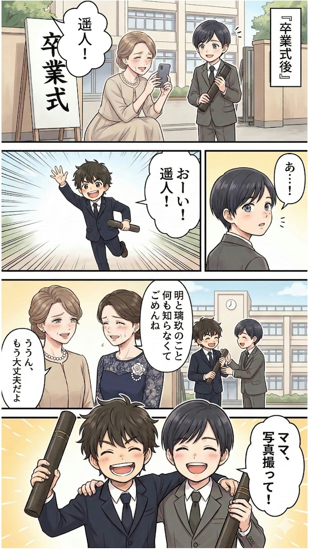 卒業式の日。とうとう璃玖君と学校に来るのは最後。母としては、幼なじみ同士一緒に写真を撮りたい気持ちなのですが、別のクラスなので彩さんとも話すタイミングがありません。遥人はあれから翔くんや拓海くんという大切な友達ができたのですが、やはり幼なじみの璃玖くんは特別に感じられていました。