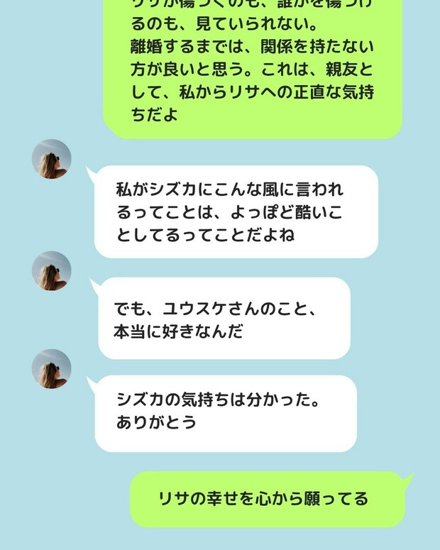 ところが、リサは再び、シズカの意見を無視するような行動をします。またしても、SNSに不倫の様子を投稿したのです。これがきっかけで、シズカはリサの連絡先とSNSをブロック。完全に、関係を断ち切ります。