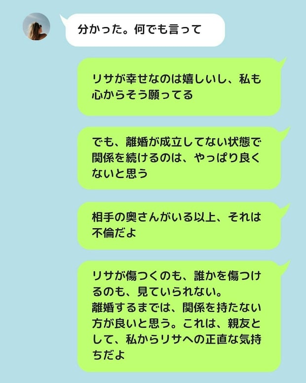 最後のメッセージを送って、私はLINEを閉じた。私の役割はこれで終わり。あとは、リサ自身の選択にゆだねるしかない…。そう自分に言い聞かせた。