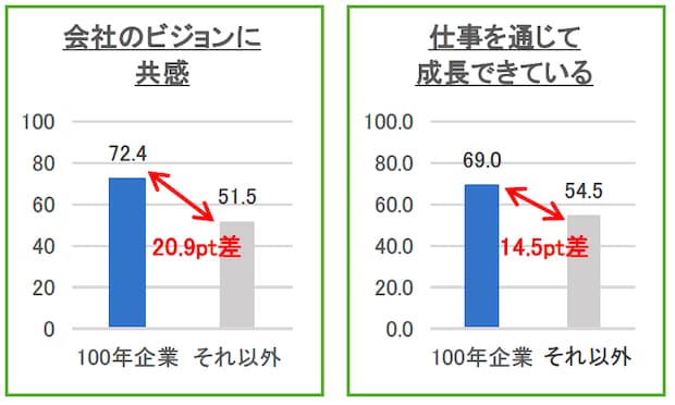 100年企業の経営者のもとで働く社員は、7割以上の社員が会社のビジョンに共感し、それ以外の会社の社員と比べて1.4倍。驚くべきことに、仕事の成長実感も、そうでないと企業と比べて1.3倍高くなっていました。