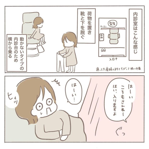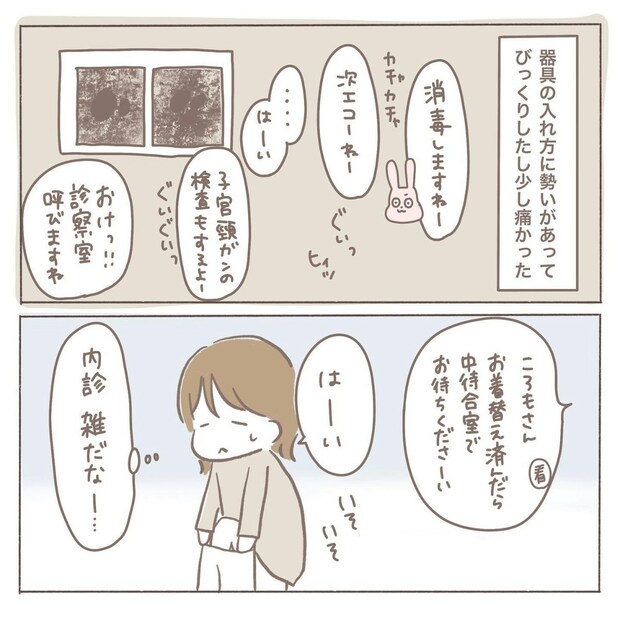 内診は雑に感じられ、痛みもあってcoromoさんは思わず身をこわばらせました。その後の診察でも先生はテキパキ進めるだけで、寄り添いはゼロ。その対応に、coromoさんの胸にはまたモヤっとした気持ちが残りました。