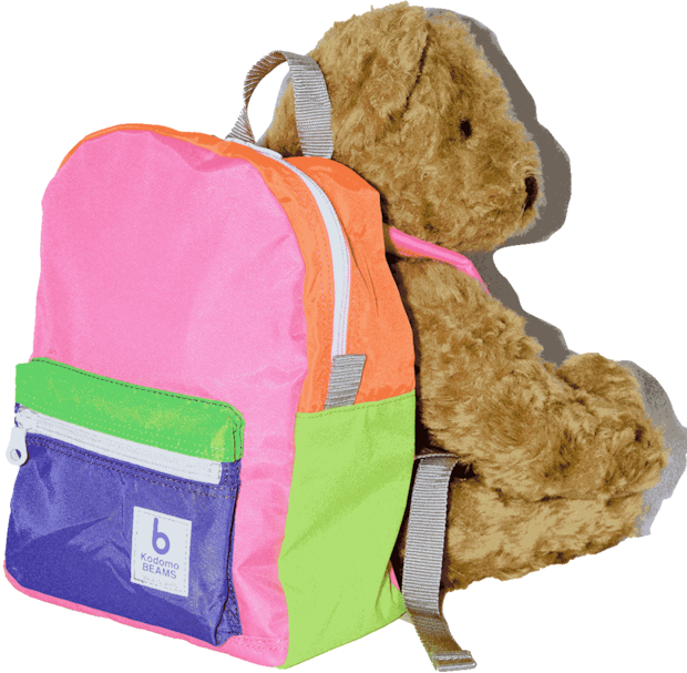 マルチカラーがポップで可愛い『こども ビームス』定番リュックのミニサイズ。小さなキッズでも背負いやすいサイズ感で、胸元のショルダーハーネスは体型に合わせて上下に調整でき、なで肩でもずれ落ちにくい安心設計。バッグの中にはネームタグがあり、ロゴはリフレクター付きで、通園中の安全もしっかり確保。雨や砂に強いナイロン素材なので毎日のお手入れが簡単なのも嬉しい。