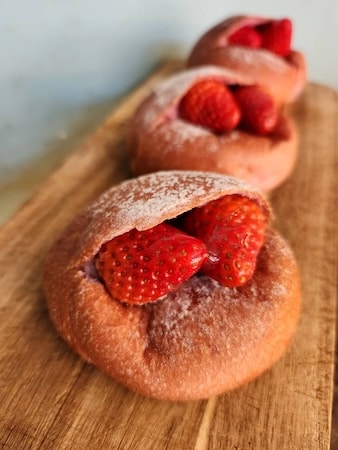 「静岡はいちごの産地。フレッシュなまま食べてほしい」そんな想いをパートナーである妻と話し合い、パン生地に切り込みを入れてフレッシュいちごを挟むというアイデアが生まれた。