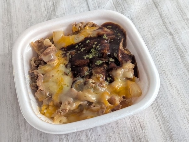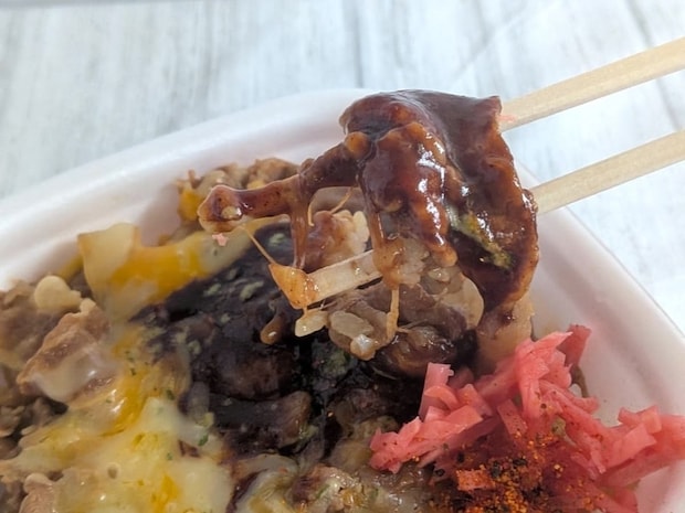チーズと一緒に食べると、まるでビーフストロガノフのようで、牛丼であることを忘れてしまいそうでした。