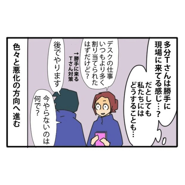 カモちもさんがかつて働いていた職場に、中途採用として入社したTさんは、仕事の認識について周囲と大きなズレがありました。Tさんと「一緒に働くのは難しい」と感じるほどの問題が起きたとき、カモちもさんを含む同僚たちが解決に向けて奮闘する姿が描かれており、人間関係や職場のあり方について考えさせられます。