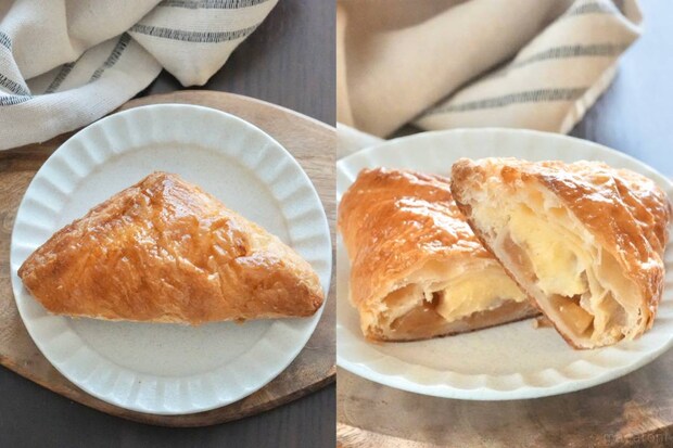 ゴロッとしたりんごの果肉を包んだ三角パイ。バニラシード入りのカスタードクリームが注入されています。