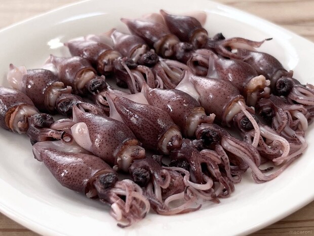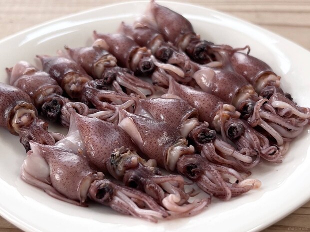 一方、湯通ししたボイルほたるいかは、全体的にふっくらとした仕上がり。色合いも鮮やかに見えます。