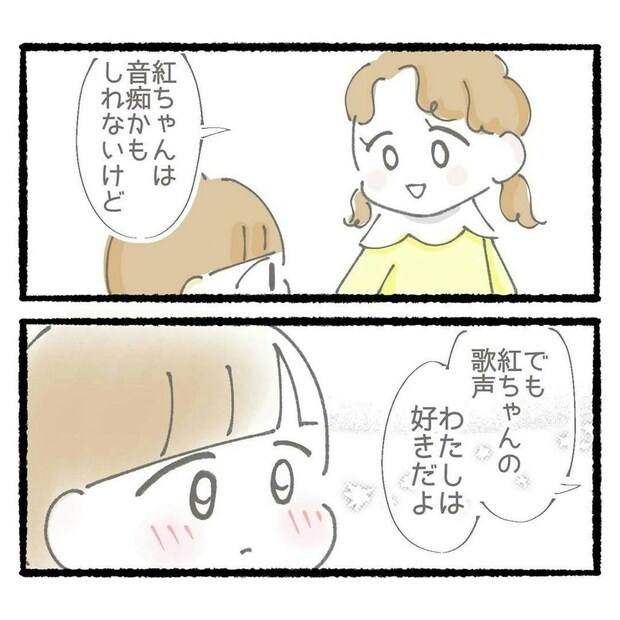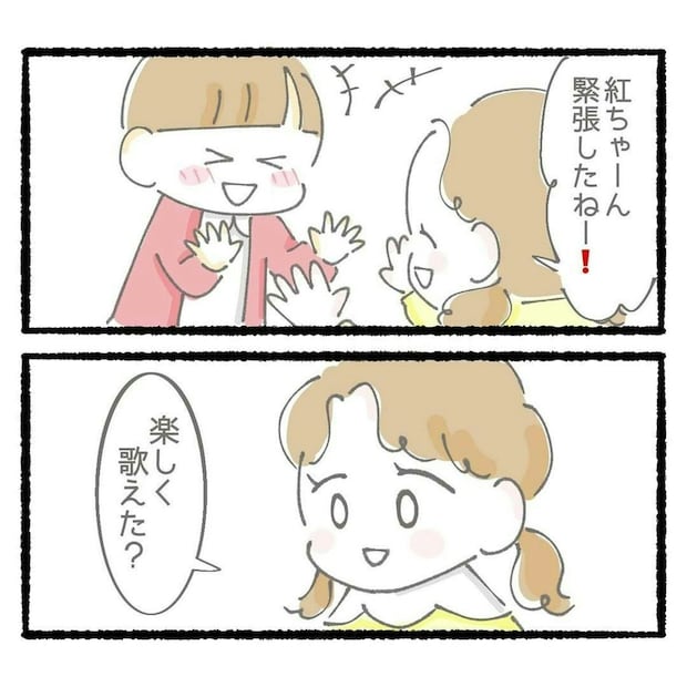 紅子さん、合唱コンクールで楽しく歌えたようですね。「うん」と、笑顔でうなずくシーンが印象的です。