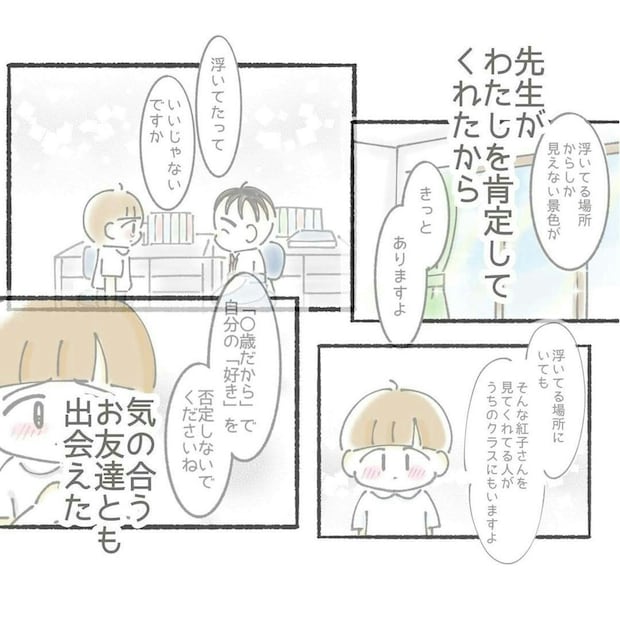 本作では、周囲と馴染めず、自分は「浮いている」と悩んだ体験談が描かれています。ですが、紅子さんを肯定してくれる先生と出会ったことがきっかけで、気の合う友だちができました。自分の居場所を見つけ、イキイキと学校生活を送る紅子さんの姿、素敵ですね。