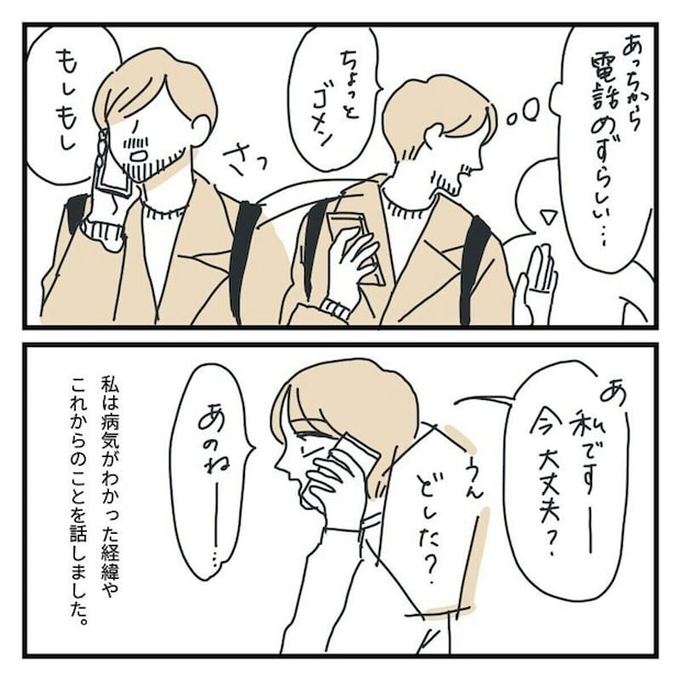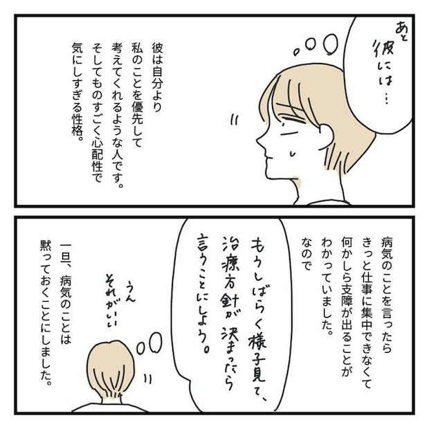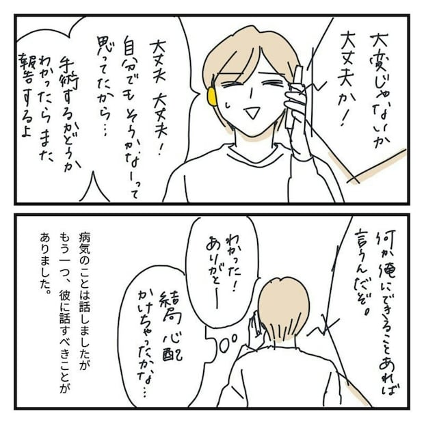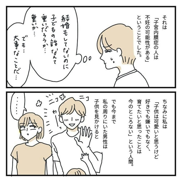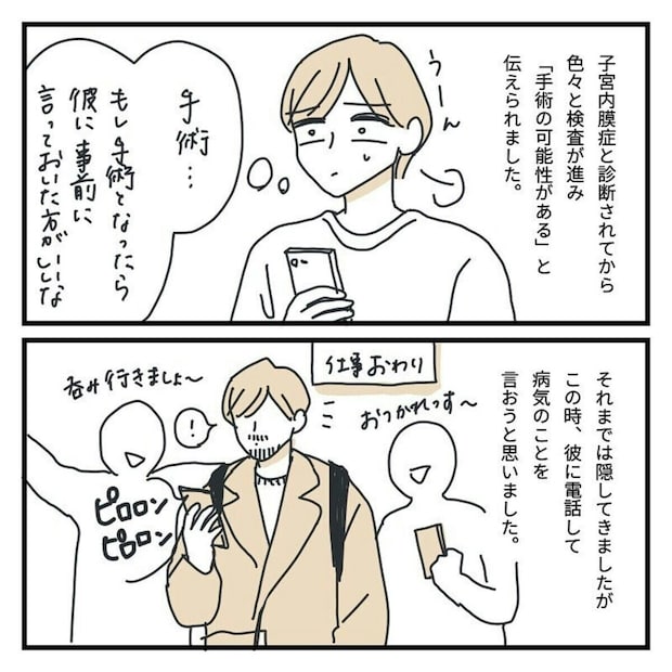 検査をしていくうちに手術の可能性が出てきたため、彼氏に子宮内膜症のことを伝えることにしたキクチさん。彼氏はキクチさんを気使い、優しい言葉をかけてくれました。キクチさんにはどうしても話しておきたいことがもう1つありました。それは、病気のせいで不妊になる可能性があるということ。彼氏が子どもを望むのかどうかを確認したいという気持ちがありました。