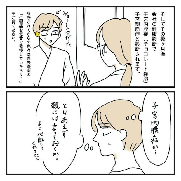 会社の健康診断で子宮内膜症がわかったキクチさん。これまでの強い痛みの原因はこれだったようですね。彼氏に伝えるべきか悩み、心配させないように一旦は病気のことを黙っておくことにします。