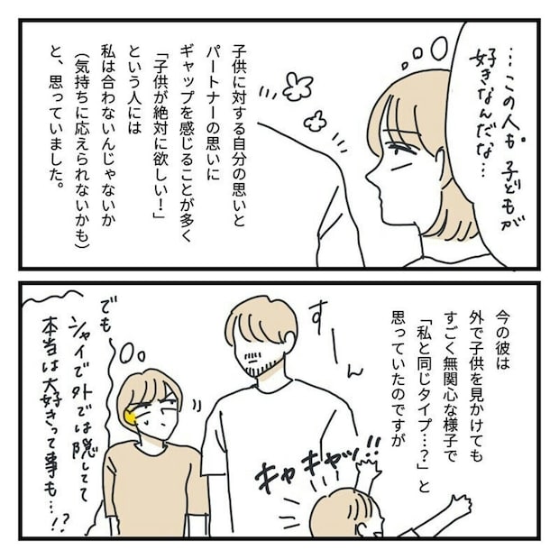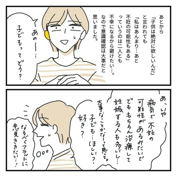 キクチさん自身は子どもを欲しいとは特に思ったことがなく、これまで付き合ってきた人との意識の差を感じていたようですね。そういった経験からも、気持ちを確認しておきたかったのでしょう。すごく自然に聞いていますが、きっと内心はドキドキしていたのではないでしょうか。