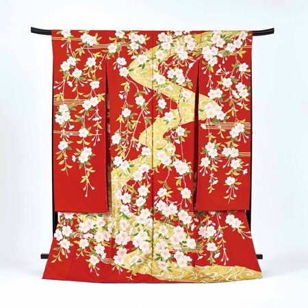 そのほか、美術・工芸品・染織品も登場。みのや 振袖「朱地にしだれ桜」表地絹100%/935,000円(限定1点)、