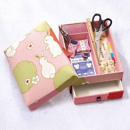 みすや忠兵衛「引出し付お裁縫揃い『三羽のうさぎ』乙女色」約縦25.0×横19.0×高さ10.0cm/18,700円(限定5箱)、