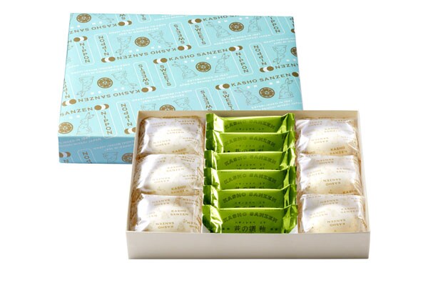 「銘菓撰 釉 日本茶 12個入」3,500円は、「萩の調 煌 ホワイト」と「萩の調 釉 日本茶」各6個入りで、両方の味を一度に楽しむことができる特別な詰合せ。