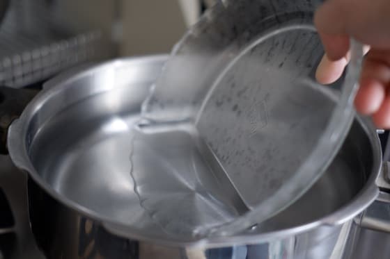 3. 鍋にお湯を沸かし、ポリ袋が鍋底に直接触れないよう耐熱皿を沈めておきます。