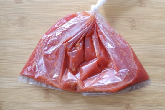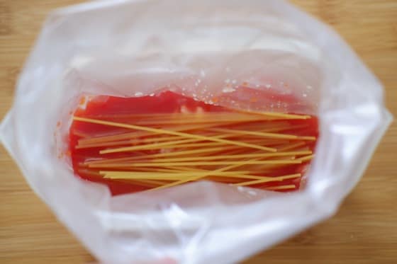 1. 湯せん調理に対応しているポリ袋に、トマトジュース、パスタ、顆粒コンソメ、ツナ缶などの材料を入れます。パスタは半分に折ると袋に収まりやすいです。パスタの先端で袋を突き破ってしまわないように注意しましょう。