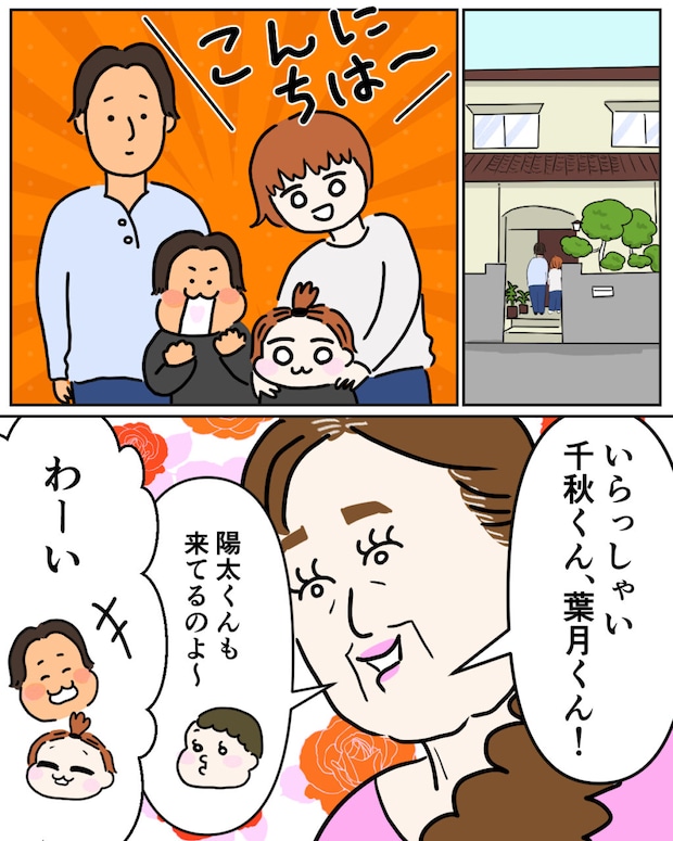私たちは、週末に家族で義実家を訪れました。「こんにちは~!」と子どもたちが元気よく挨拶すると、「いらっしゃい、千秋くん、葉月くん!」と義母が笑顔で迎えてくれます。従兄弟の陽太くんも来ていると聞きいた子どもたちは、「わーい」と大喜びで家の中へ駆け込んでいきました。