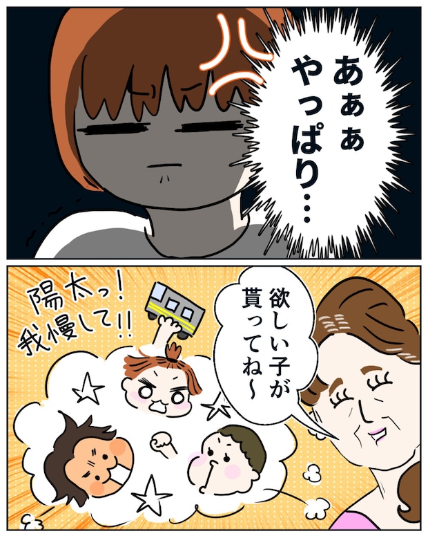 すると、義兄嫁のしのぶさんが、「陽太、同じの買ってあげるからこれは我慢しよっか」と声をかけます。だけど陽太くんは不満そう。私はしのぶさんに「そんな!大丈夫ですうちは・・・2人なので結局喧嘩になるので」と遠慮します。けれど、しのぶさんも「でもこの間も同じ理由で陽太が貰ってるから」と同じように遠慮して埒が明きません。