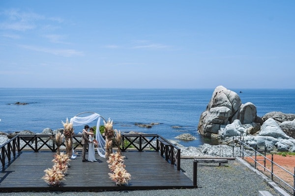 福井県内では、海を真正面に望むロケーションで本格的に人前式を行う取り組みは珍しいそう。日本海を一望する絶景ロケーションでの人前式のほかにも、オリジナル誓約文・演出の自由設計、少人数婚・家族婚にも対応している。