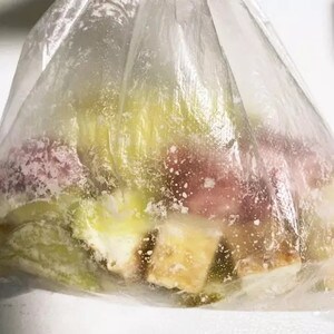 2.ポリ袋にレンチンしたじゃがいもと厚揚げ、豚肉を入れ、片栗粉を全体になじむようにふります。