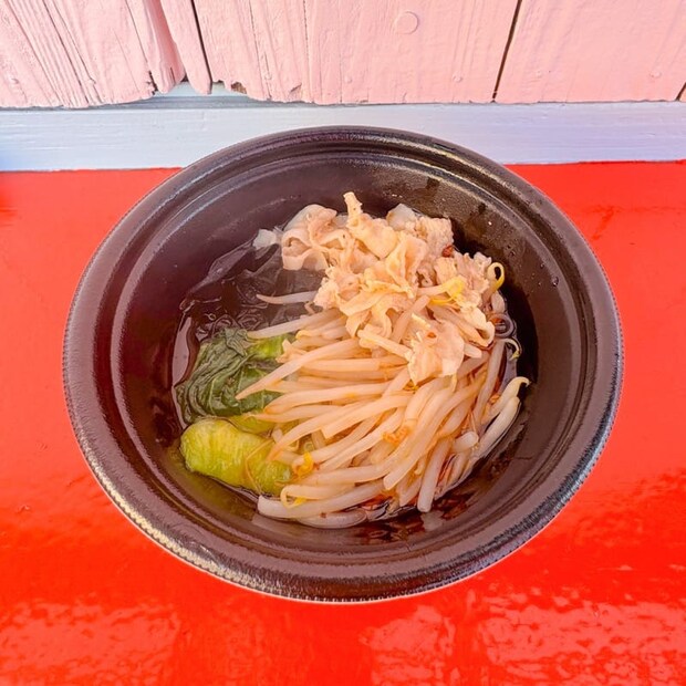 シャキシャキのもやしやきくらげ、ちんげんさいや豚肉のトッピングがすべて手作りのピリ辛スープと相性抜群!