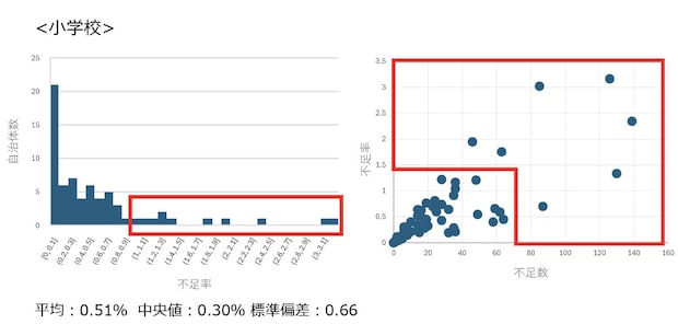 公立小中学校の定数については全国平均で充足していますが、不足の状況は自治体ごとにばらつきが大きく、一部の不足数の多い自治体が全国平均を押し上げている構造です。令和3年度と比較すると23自治体において改善し、43自治体において悪化しています。