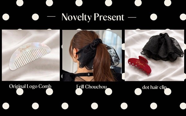 15,000円(税込)以上の購入で「オリジナルロゴ入りコーム」、30,000円(税込)以上の購入で「オリジナルフリルシュシュ」がもらえる。